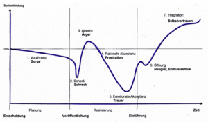 Nun wird der emotionale Tiefpunkt erreicht. Trauer stellt eine Schwellenemotion im Veränderungsprozess dar. Die Wahrscheinlichkeit eines Projektabbruchs ist in dieser Phase am größten.
